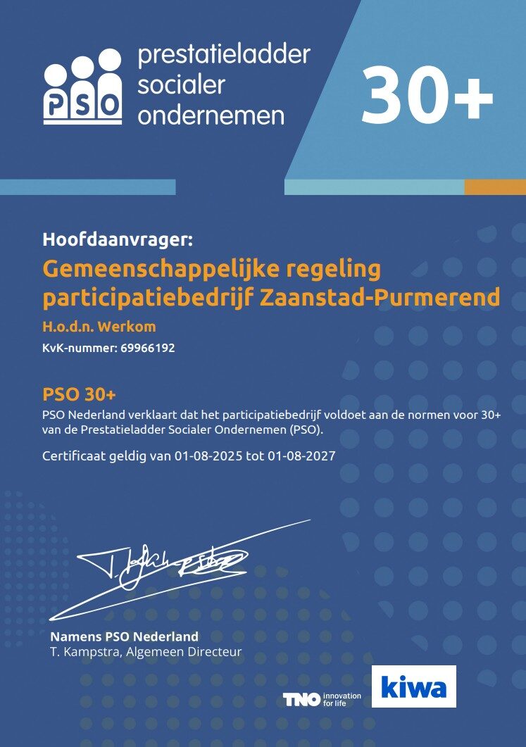 Werkom is gecertificeerd voor de prestatieladder socialer ondernemen (30+).