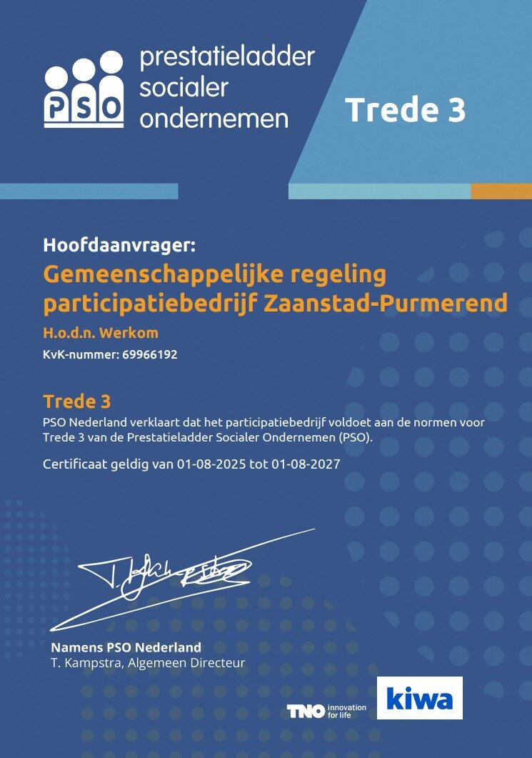 Werkom is gecertificeerd voor de prestatieladder socialer ondernemen (Trede 3).