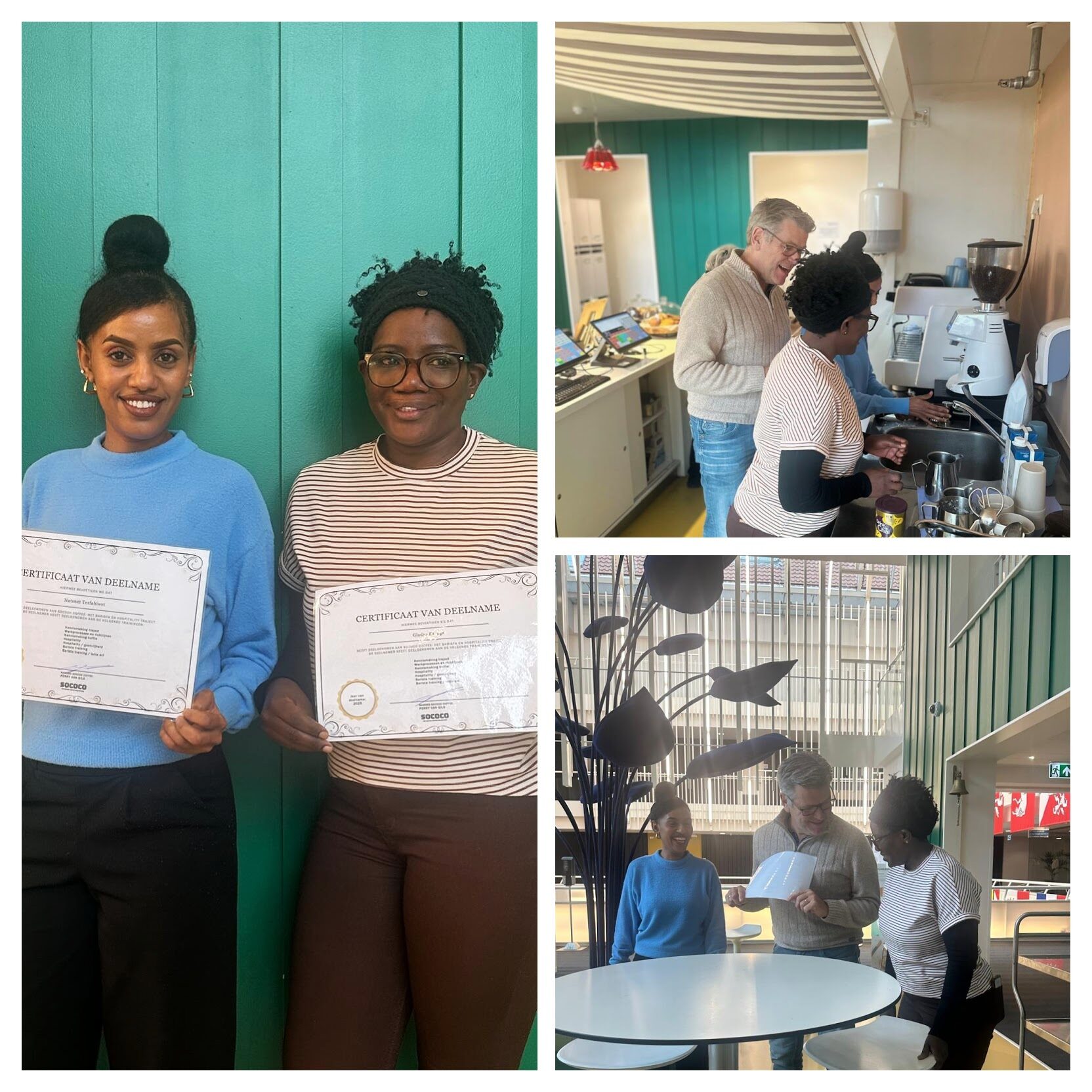 Gefeliciteerd! De afgelopen 12 weken hebben Natsnet en Gladys het SOCOCO Coffee leerwerktraject gevolgd binnen Werkom. Perry heeft diverse trainingen gegeven, zoals Barista, Hospitality en werknemersvaardigheden. De dames hebben gewerkt aan hun skills en vaardigheden binnen de catering. En met succes: zij hebben hun certificaat behaald!
