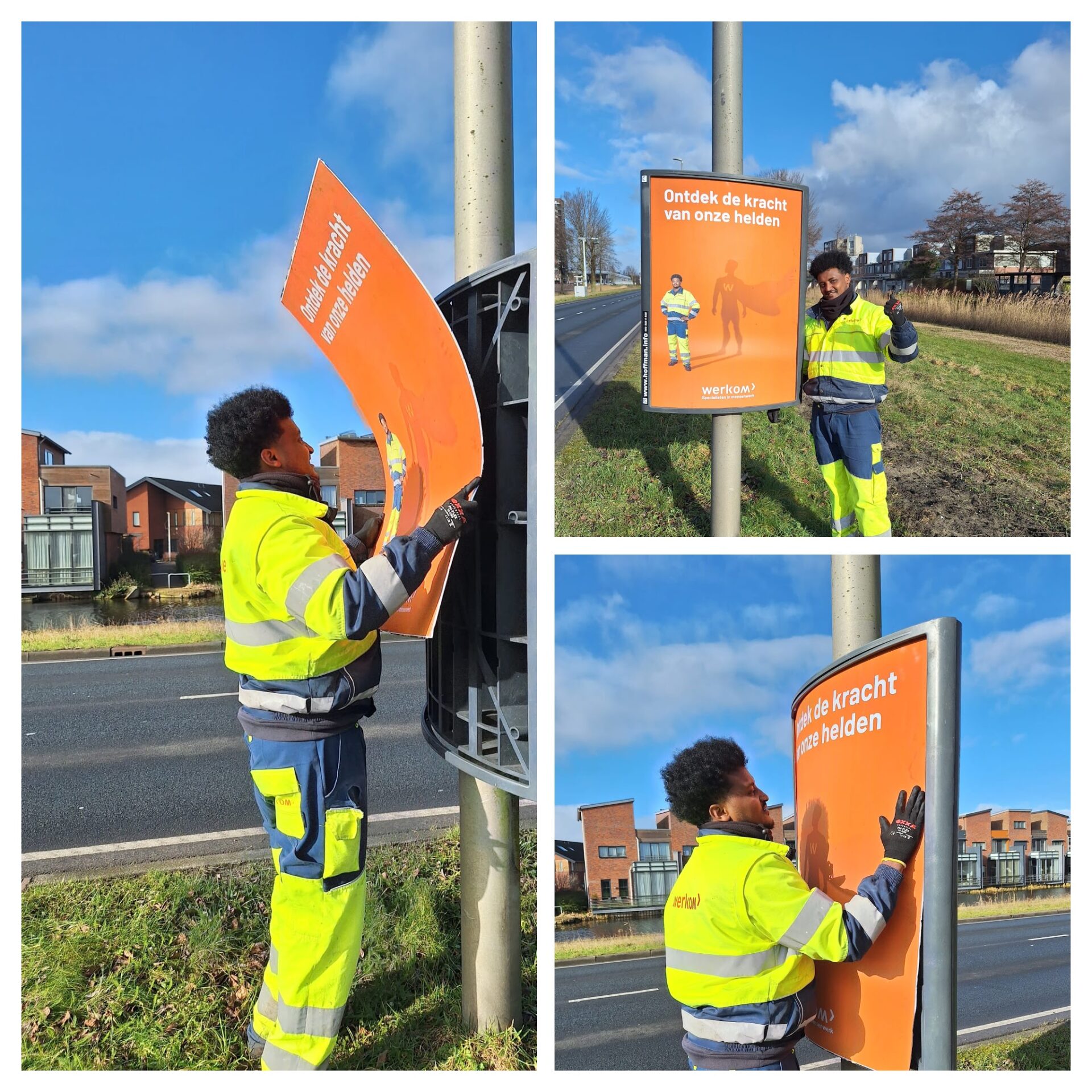 Onze collega’s van Groenonderhoud hingen deze week in Purmerend nieuwe campagneposters van Werkom op. Deze keer is hun collega Yakob de held! Hij hielp zelf ook mee. “Ik vond het leuk om te doen.” 🧡